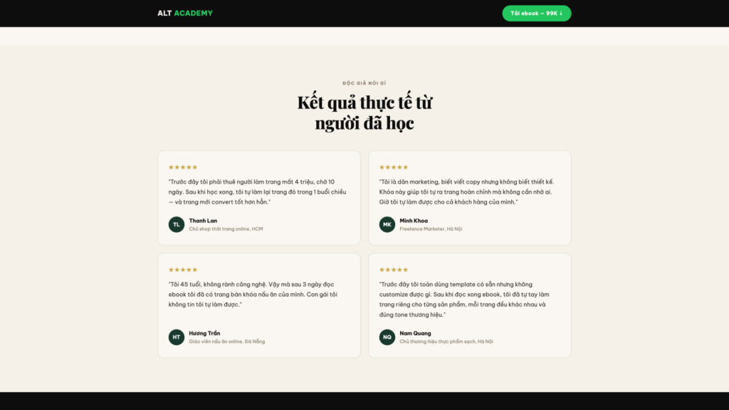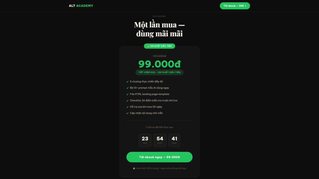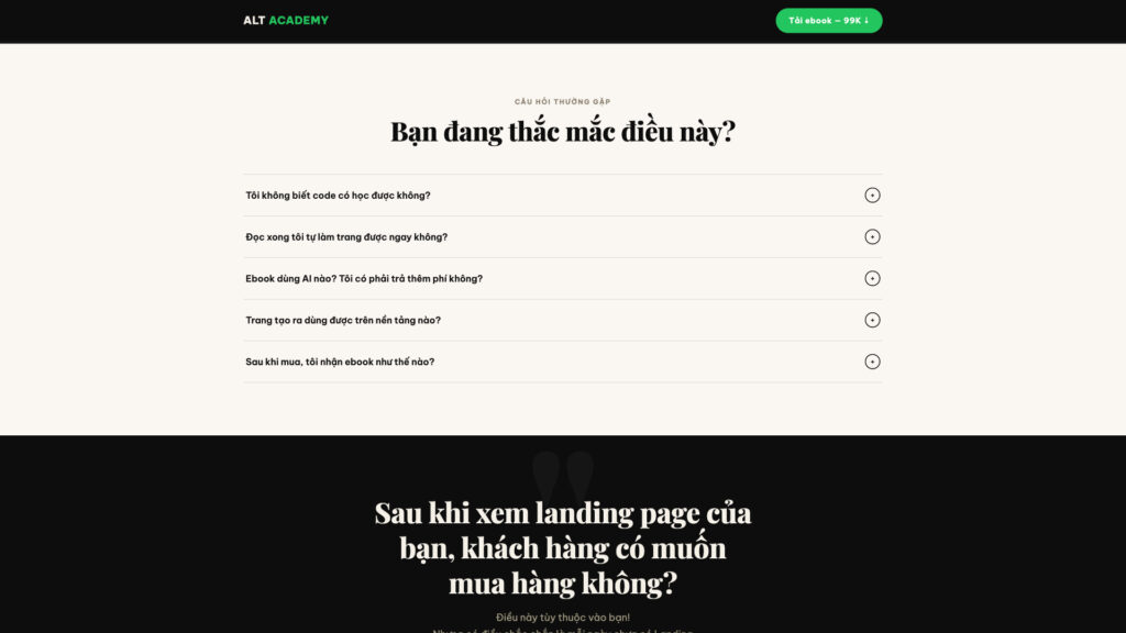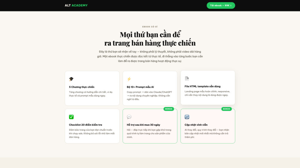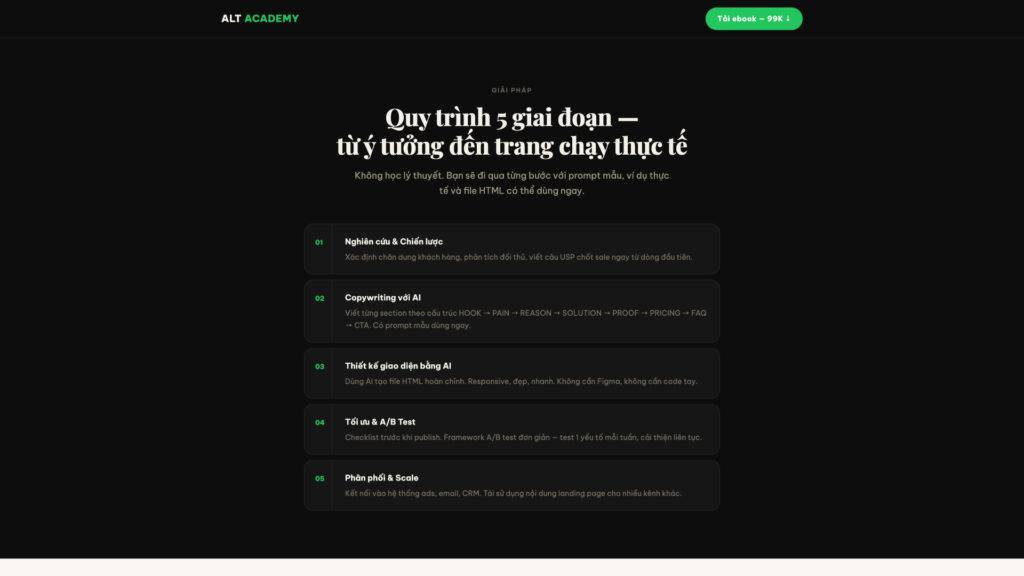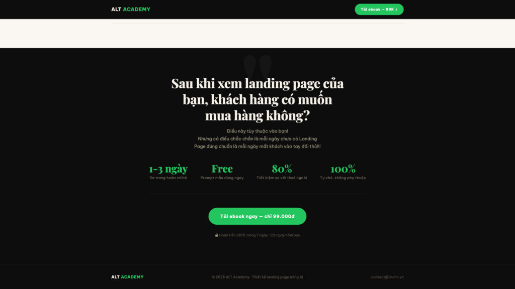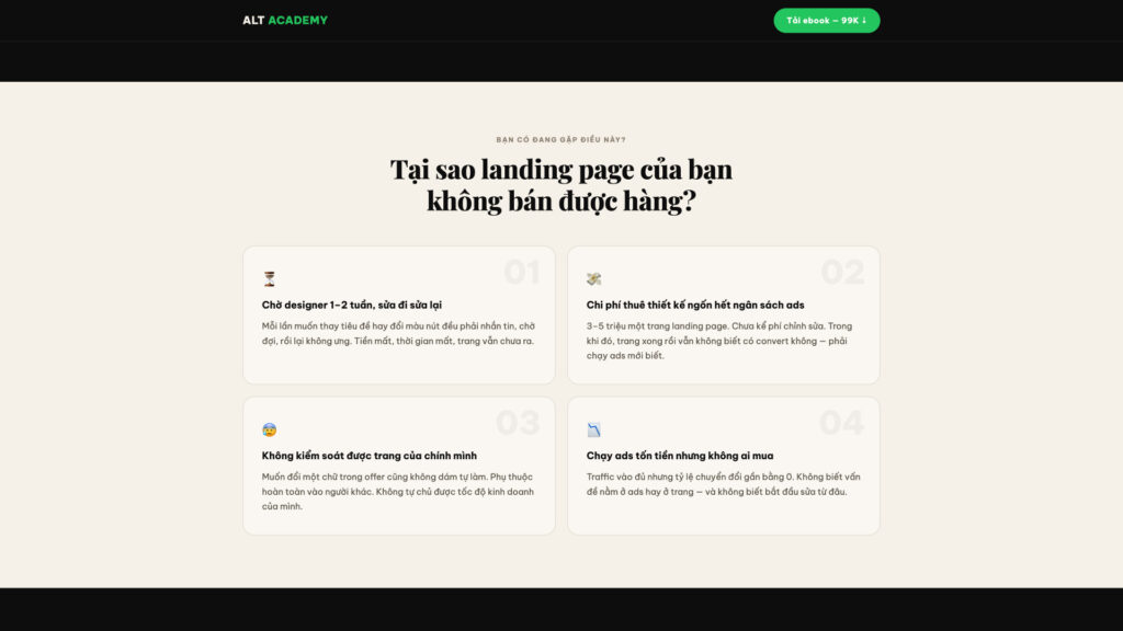 Nếu bạn đang chạy quảng cáo, bán khóa học hay sản phẩm online mà khách vào trang rồi thoát, nguyên nhân thường không phải “thiếu năng lực” mà là thiếu quy trình rõ ràng và công cụ phù hợp. Trang landing mới của ALT Academy được xây dựng quanh một đề xuất cụ thể: ebook “Quy trình thiết kế landing page bán hàng — tối ưu chuyển đổi”, kết hợp AI để bạn có thể tự tạo trang chuyên nghiệp mà không bắt buộc phải biết lập trình.