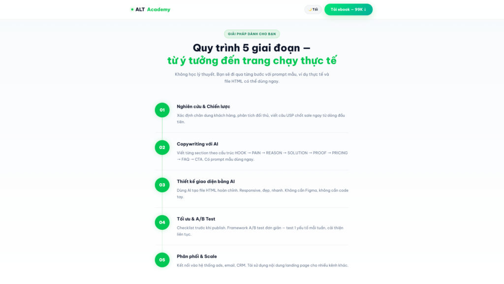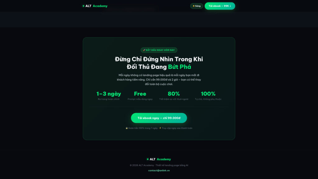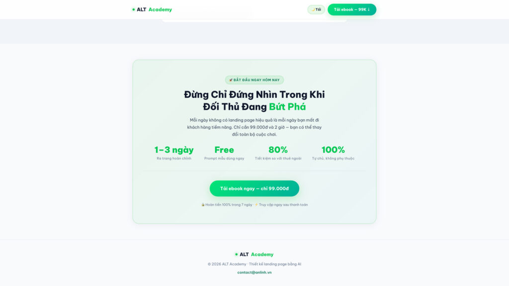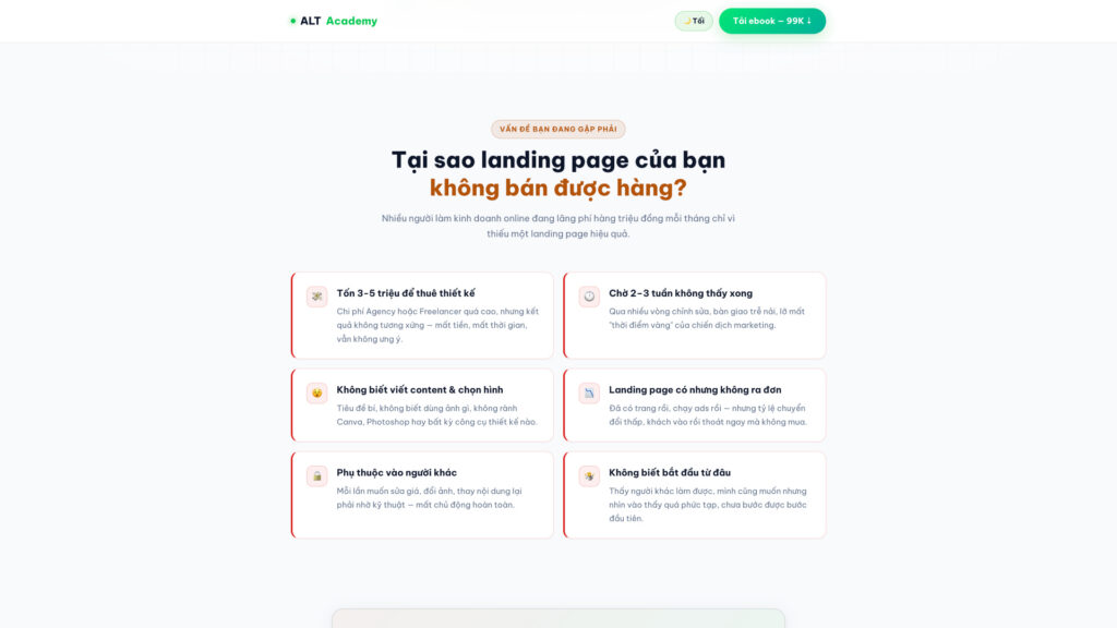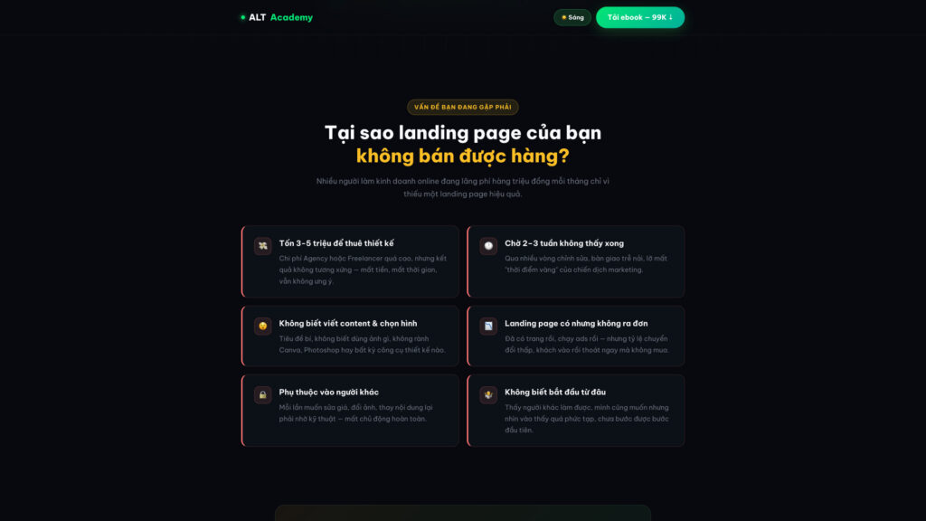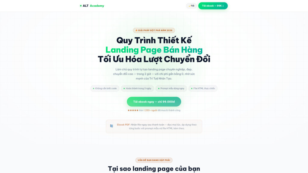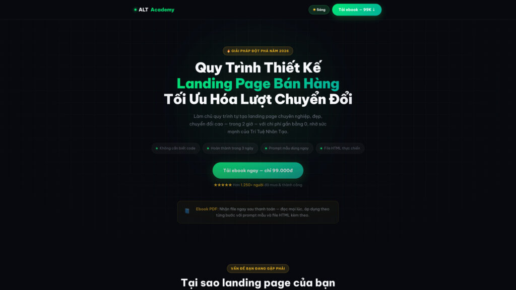 Nếu bạn đang chạy quảng cáo, bán khóa học hay sản phẩm online mà khách vào trang rồi thoát, nguyên nhân thường không phải “thiếu năng lực” mà là thiếu quy trình rõ ràng và công cụ phù hợp. Trang landing mới của ALT Academy được xây dựng quanh một đề xuất cụ thể: ebook “Quy trình thiết kế landing page bán hàng — tối ưu chuyển đổi”, kết hợp AI để bạn có thể tự tạo trang chuyên nghiệp mà không bắt buộc phải biết lập trình.