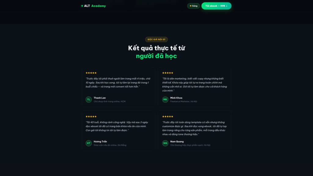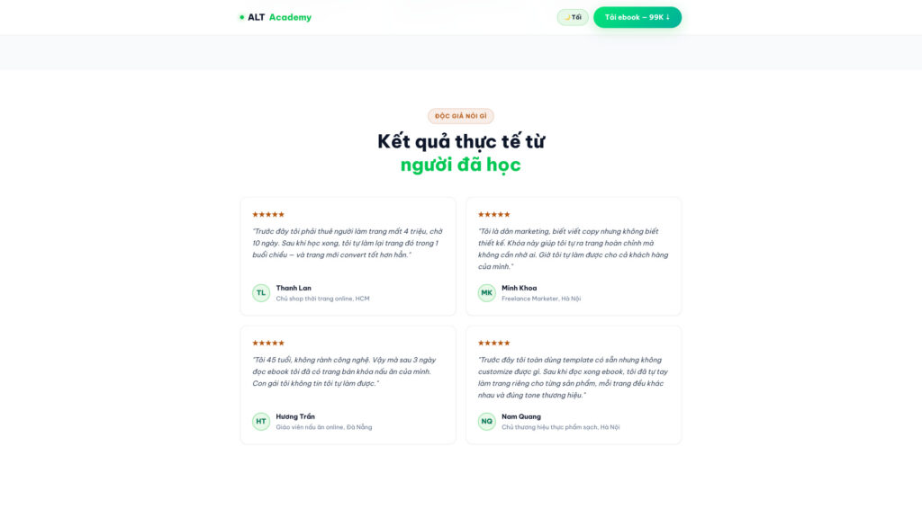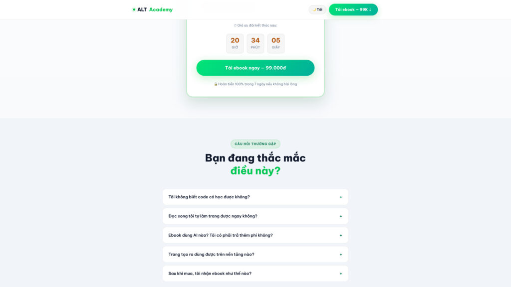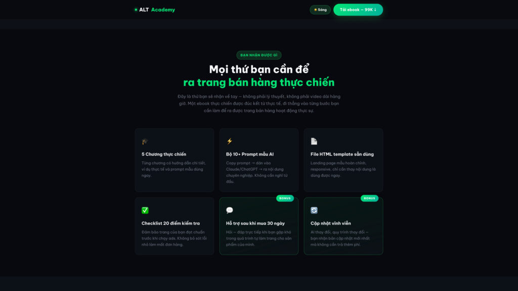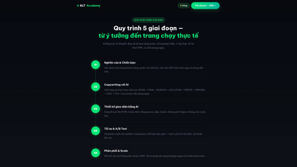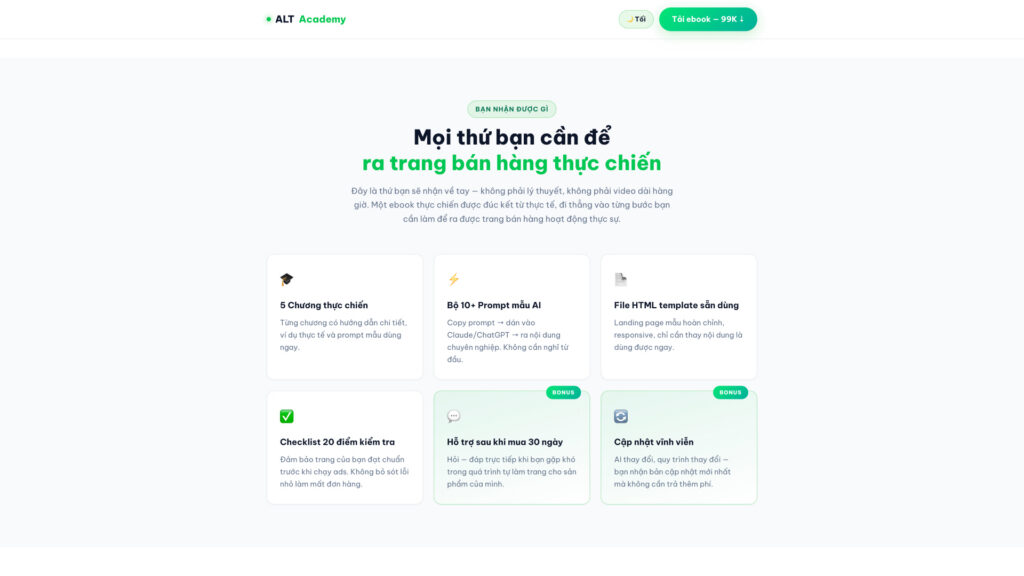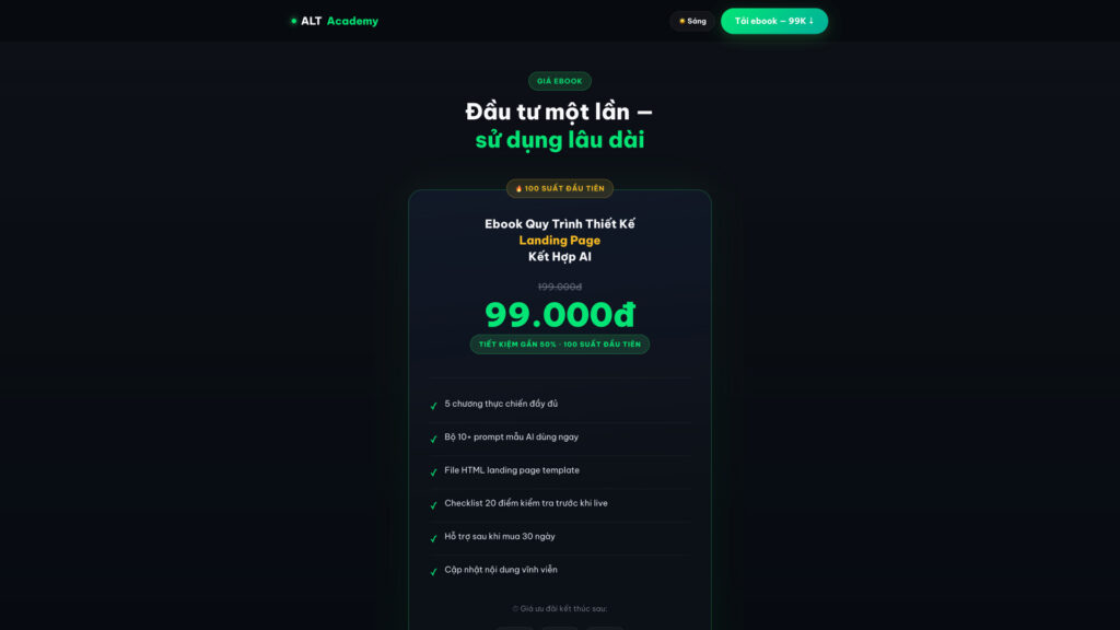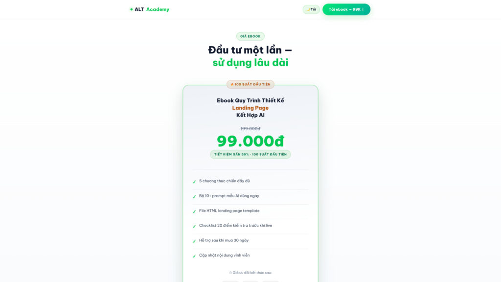 Nếu bạn đang chạy quảng cáo, bán khóa học hay sản phẩm online mà khách vào trang rồi thoát, nguyên nhân thường không phải “thiếu năng lực” mà là thiếu quy trình rõ ràng và công cụ phù hợp. Trang landing mới của ALT Academy được xây dựng quanh một đề xuất cụ thể: ebook “Quy trình thiết kế landing page bán hàng — tối ưu chuyển đổi”, kết hợp AI để bạn có thể tự tạo trang chuyên nghiệp mà không bắt buộc phải biết lập trình.