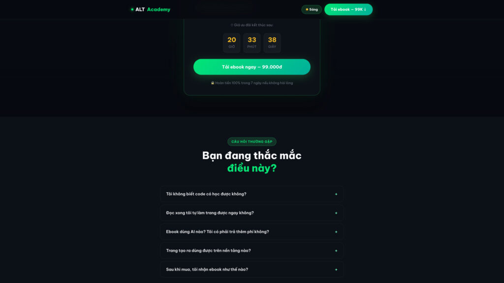 Giao diện landing có chế độ sáng/tối, bố cục rõ phần vấn đề — giải pháp — bằng chứng — giá — FAQ — lời kêu gọi hành động, phù hợp để bạn vừa đọc giới thiệu vừa soi cách một landing bán ebook được cấu trúc.