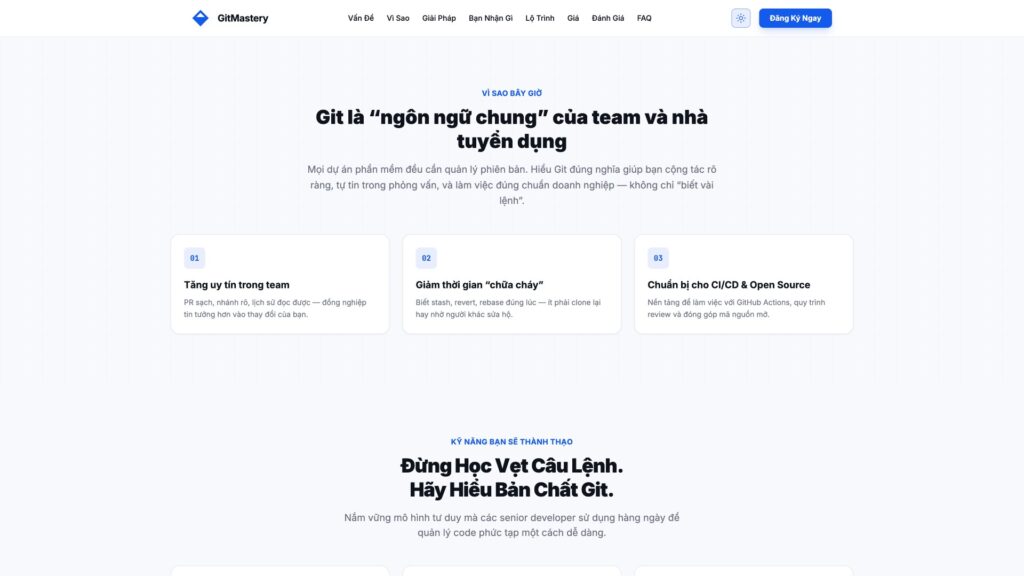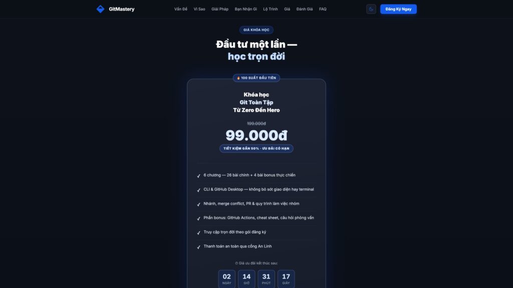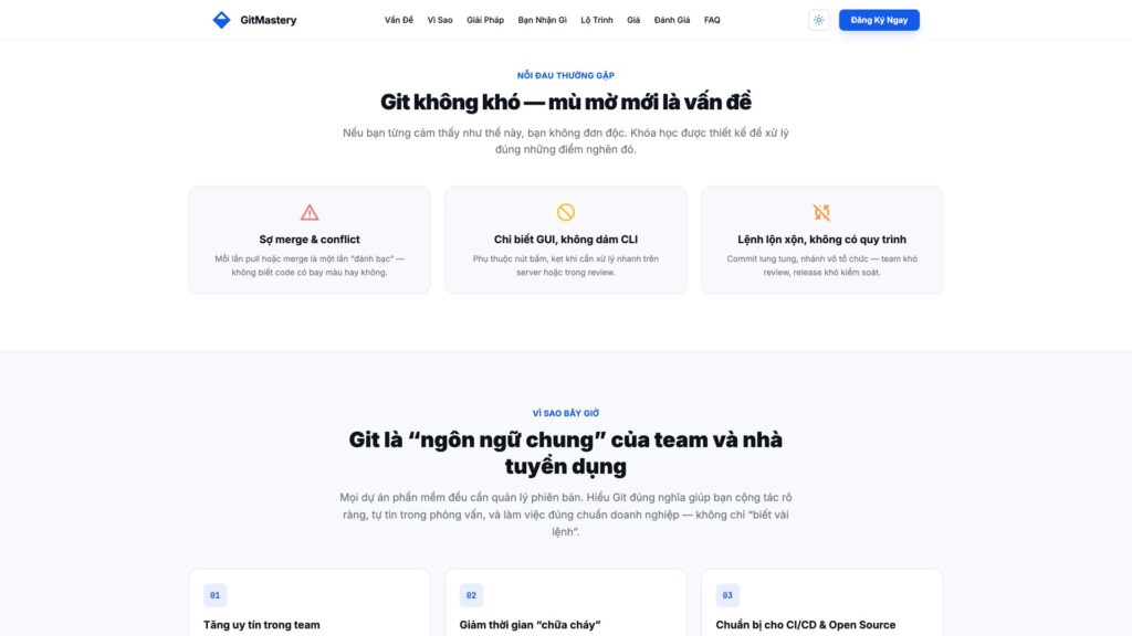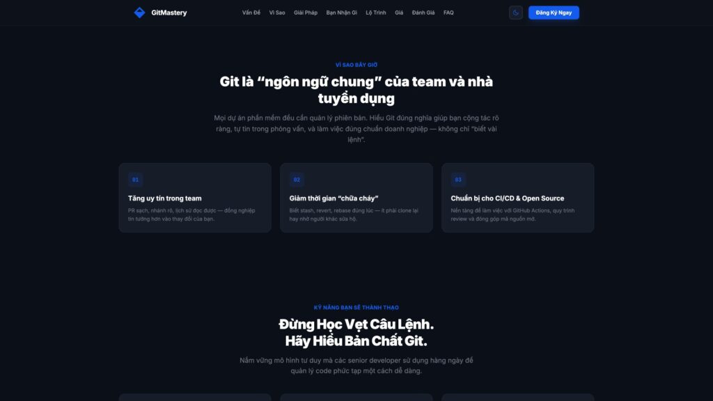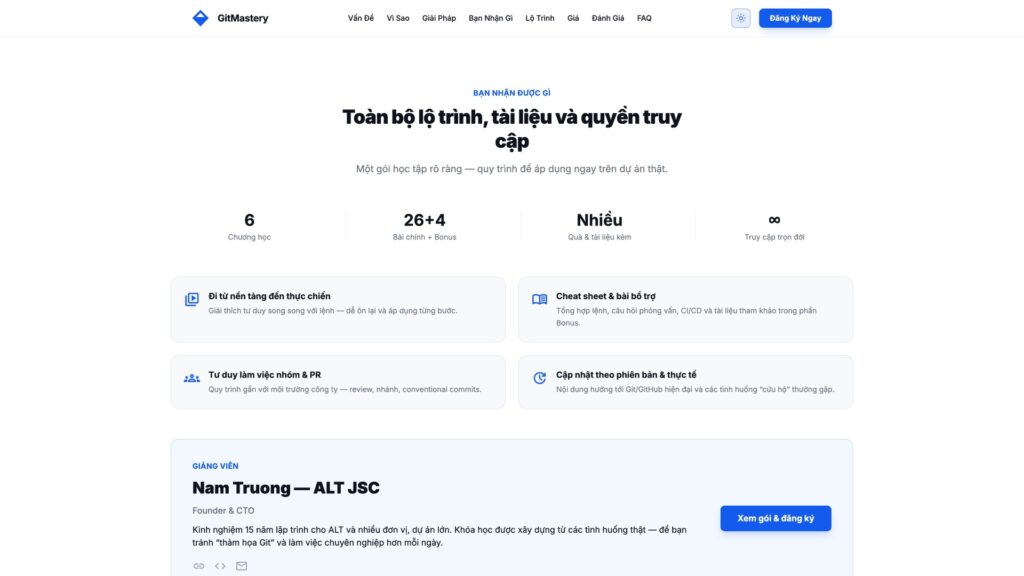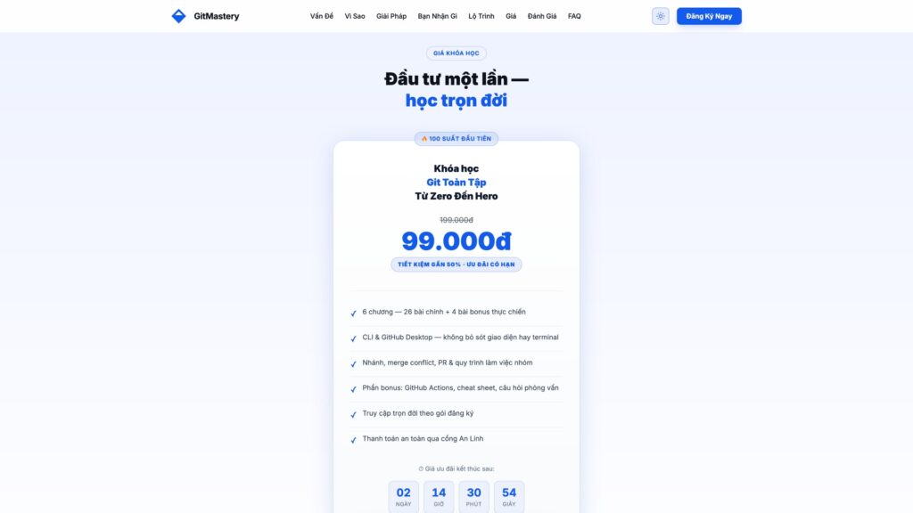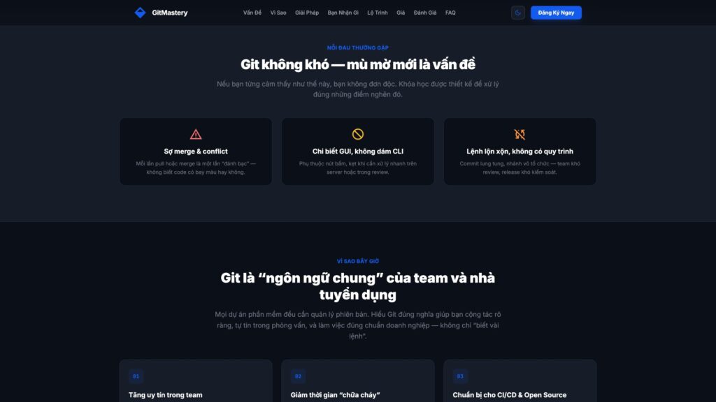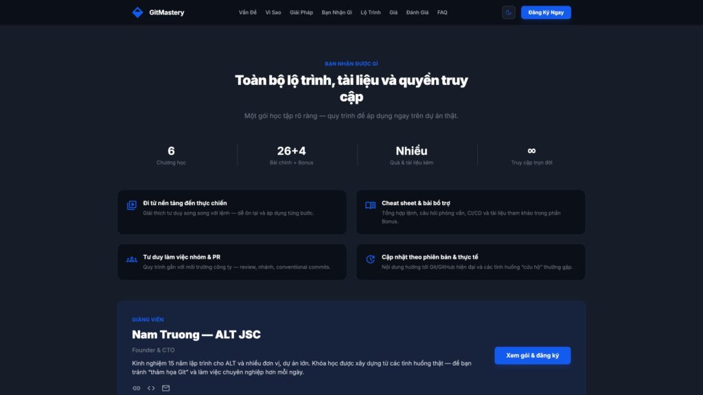 Bạn đang chuẩn bị ra mắt một khóa học về IT, Lập trình (Git, React, Nodejs…)? Bạn muốn giao diện website phải toát lên sự chuyên nghiệp, chuẩn “dân công nghệ” nhưng lại không muốn tốn 10-15 triệu và chờ đợi hàng tuần để thuê dịch vụ thiết kế?