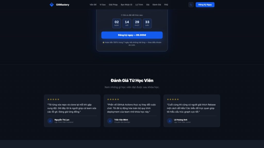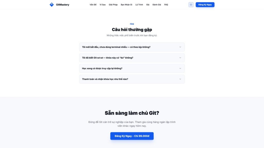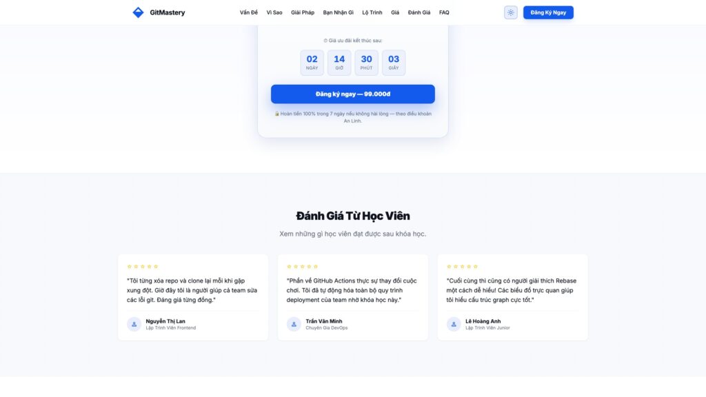 - Bố cục thuyết phục tâm lý 8 bước: Chứa đầy đủ các section quan trọng nhất để bán khóa học: Hero > Nỗi đau (Pain points) > Lý do chọn > Kỹ năng đạt được > Lộ trình học (Accordion Toggle) > Bảng giá > Đánh giá học viên > Câu hỏi thường gặp (FAQ).